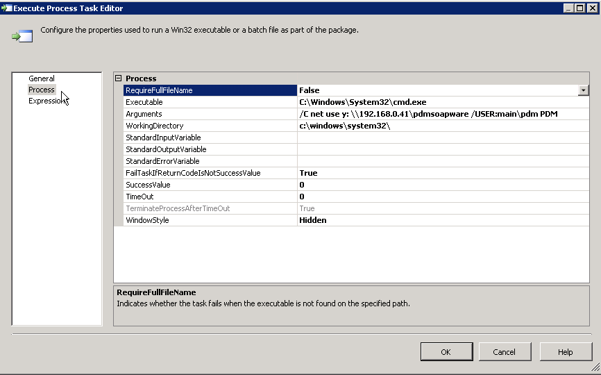 In the execute process task we are doing something I am certain most of you have done before – use the command interpreter – cmd.exe – to map a network drive using the NET USE command. For those that need a refresher on the NET USE command, visit this TechNet web page.