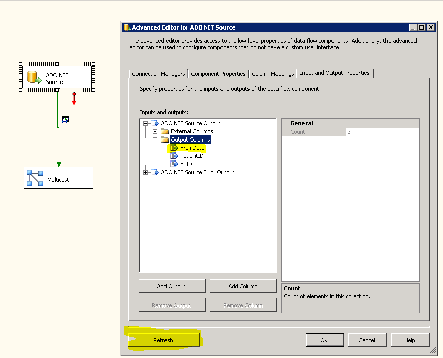 Notice that only dates for 4/10/2015 or higher are shown (I added an Order By to the SQL Statement in strSQL and 4/10/2015 is what was in our LoadControl Table).  This is where our Expression was evaluated and placed in for the SQL Command of the ADO.Net source.  One thing of note, notice how before I set up a SQL statement in the ADO.NET Connection when I first created it earlier.  This statement is IGNORED when the Expression is evaluated.  However, if the SQL Statement in your Expression adds or changes columns, you may need to go into the Advanced Editor of the ADO.NET Connection and click Refresh to get those changes to show.  Otherwise, your new or changed columns may not show up in the data flow right away.
