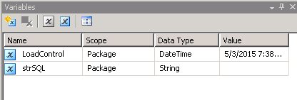 It appears we have no way to dynamically build SQL statements when using ADO.Net providers.  And to think I’ve been standardizing on them.  On the other hand, maybe we do have a way.  I made a package with two variables.  One is a DateTime called LoadControl and the other is a string called strSQL.  I’m going to load a DateTime from a load control table into the LoadControl variable then use the LoadControl variable to build the WHERE clause of a SQL statement to pull out all medical claims with a date of service greater than or equal to the LoadControl date.  First, our variables.