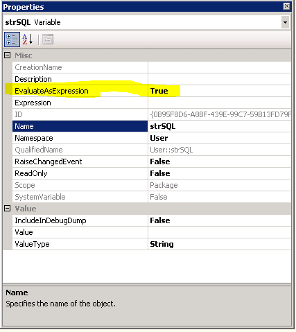 The only thing I’ve done is set up the ADO.Net Source.  Now we need to get our strSQL variable populated.  First, be certain to set the property EvaluateAsExpression to TRUE for strSQL.